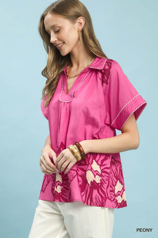 Botanical Print Contrast Trim Button Blouse - Umgee - Exclusively Online