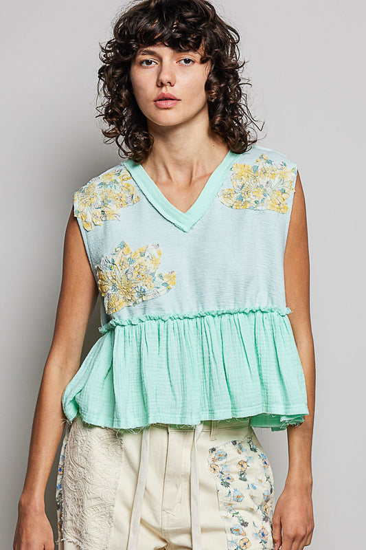 Patch Ruffled Sleeveless Top with Raw Edge Detail - Exclusively Online