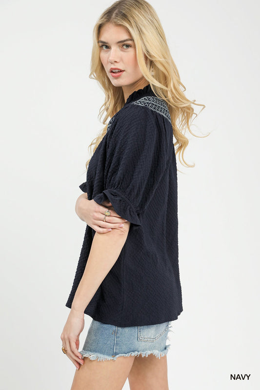 Textured Henley Blouse with Ruffle Cuffs - Umgee - Navy - Exclusively Online