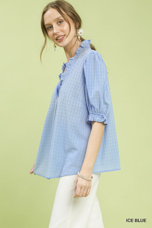 Textured Check Ruffle V-Neck Blouse - Umgee - Exclusively Online