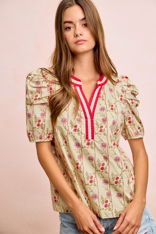 Floral Gather Sleeves Contrast Neckband Blouse Top - Exclusively Online