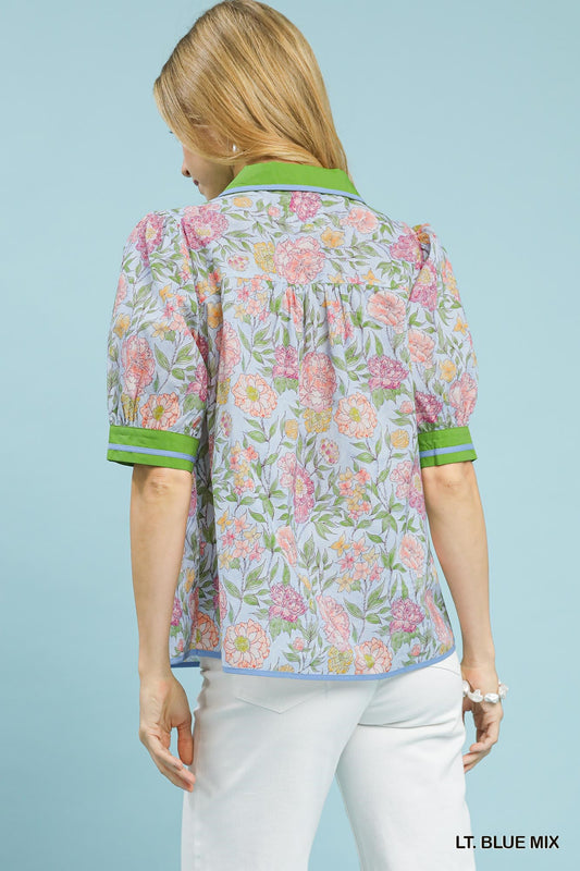 Floral Puff Sleeve Blouse with Contrast Trim - Umgee - Exclusively Online